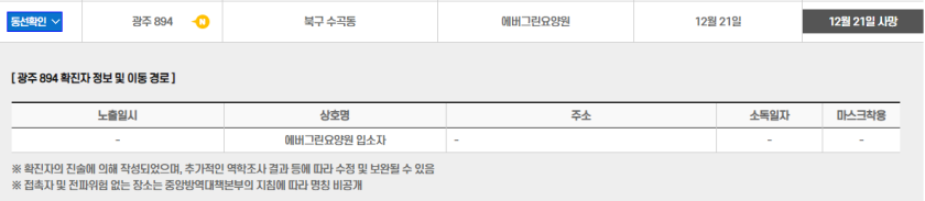 ◆ 에버그린요양원 집단감염은 요양보호사인 광주885번이 어제 아침 확진 판정을 받은 후, 요양원 환자와 직원 전수검사 과정에서 확인됐습니다. 광주885번은 앞서 확진 판정을 받은 광주868번(지인)과 접촉했고, 감염경로는 현재 조사 중입니다. 우리시는 오늘 요양원에 대한 현장 위험도 평가 후 요양원에 남아있는 환자 이송‧전원, 코호트 및 자가격리, 환자 재배치 등의 사항을 결정할 예정입니다.