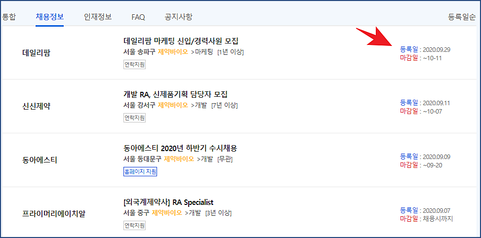 검색 후 결과 화면은 검색 조건에 맞게 구인구직 정보가 나타납니다. 중요하게 봐야 할 점은 등록일과 마감일입니다. 지원을 하기 위해서 이 기간에 맞춰 신청해야 합니다.