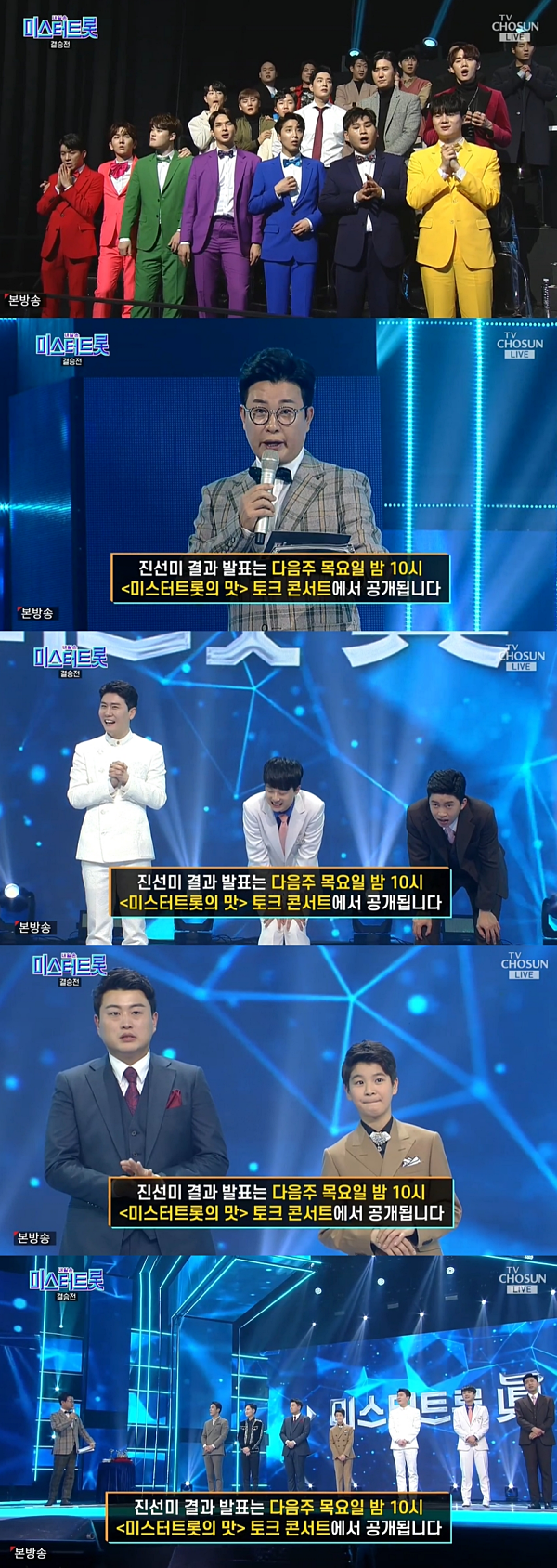 결국 일주일 뒤 결과를 미루고 밤늦게까지 진행된 미스터트롯 결승은 반쪽으로 끝났습니다. 다음날 제작진의 발표에 따르면 총 773만 1761건의 문자 투표가 이루어졌고 7명의 득표수를 분류하는데 서버 속도가 급격히 느려졌다고 합니다. 결국 불가피하게 최종 발표를 보류하기로 결정했다고 말했습니다.