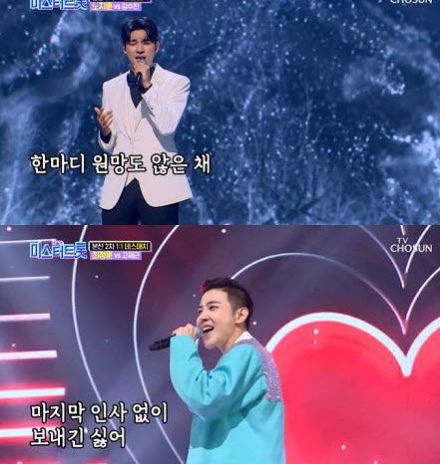 다음 무대는 김준수 닮은 꼴 이도진과 판소리 트로트 최강자 강태관니다. 이 둘의 경연은 아이돌 출신과 국악 전공자라는 서로 상반된 배경을 가진 대결이라 흥미진진했습니다. 상반된 매력으로 이도진은 '사랑의 미로'를 강태관은 '당신의 눈물'로 색다른 무대 연출 헸습니다. 결과는 강태관이 하트 8개를 차지하며 다음 라운드 진출했습니다.