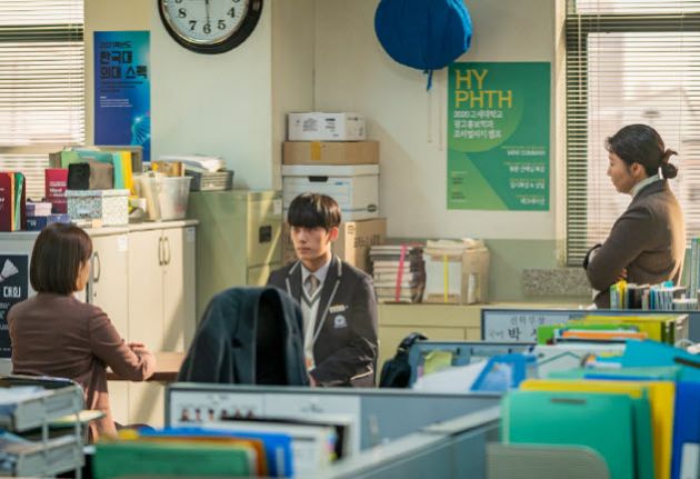 예고편을 보면 진학부 교무실의 모습이 그려졌습니다. 분위기가 살벌해 보였는데요. 무슨 일인지 교무실에 불려 온 황보통 그리고 그의 말에 귀 기울이는 담임 고하늘의 모습이 시선을 사로잡았습니다.