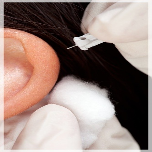 바늘의 치수는 착용하는 귀걸이보다 1.3mm 피어스를 원한다면 두께 2mm 바늘을 사용하는 것이 효과적입니다. 귀를 찌르기 전에는 소독이 필수, 이소프로필 알코올의 70%를 면봉에 묻혀 귀를 닦고 윤이 나는 부분이 완전히 마를 때까지 기다립니다.
