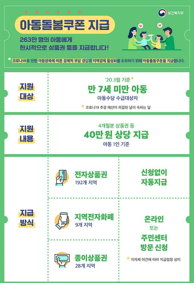 아동돌봄쿠폰은 코로나19 영향으로 아동 양육가구의 경제적 부담을 줄위기 위해 지원하는 것으로 아동 1명당 40만원 상당의 상품권 등으로 지급되는 것을 말합니다.