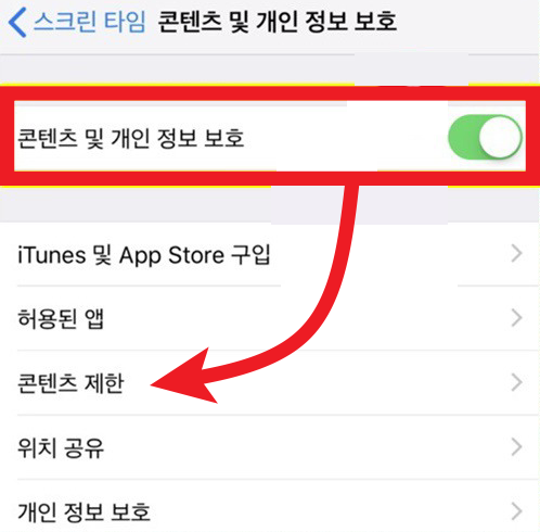 설정 방법은 간단합니다. 먼저 [설정]으로 이동합니다. [스크린 타임]을 순차적으로 탭 합니다. 이후 [콘텐츠 및 개인정보 보호 제한]을 선택한 후 버튼을 옆으로 밀어 기능을 활성화합니다.