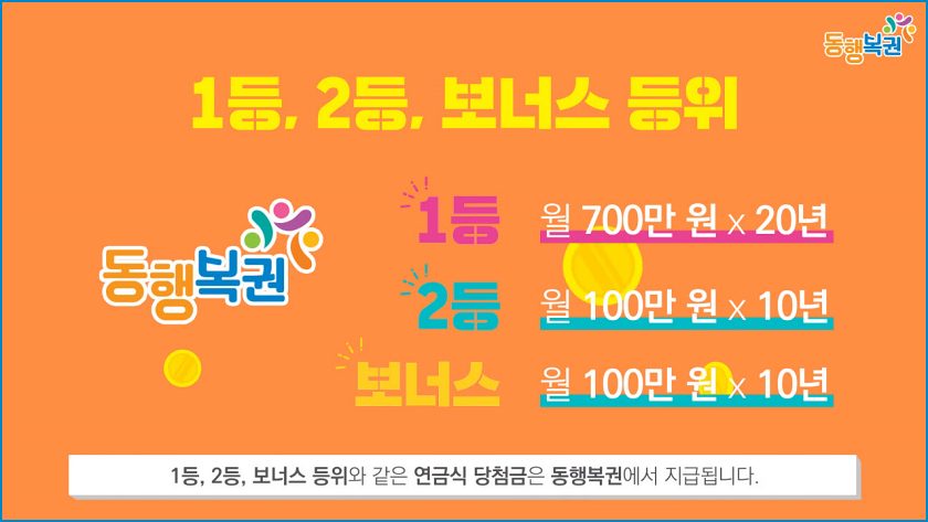 1등, 2등과 보너스 당첨금인 연금식 당첨금은 동행 복권에서 지급됩니다. 1등은 월 700만 원 20년, 2등과 보너스는 월 100만 원 10년 동안 지급받습니다. 이 주인공은 바로 여러분입니다. ^^