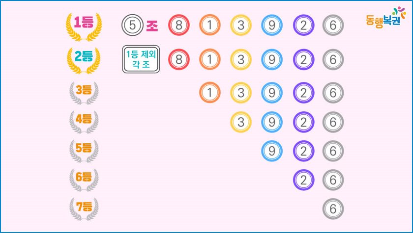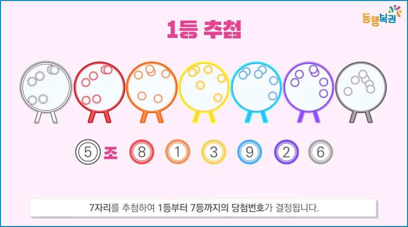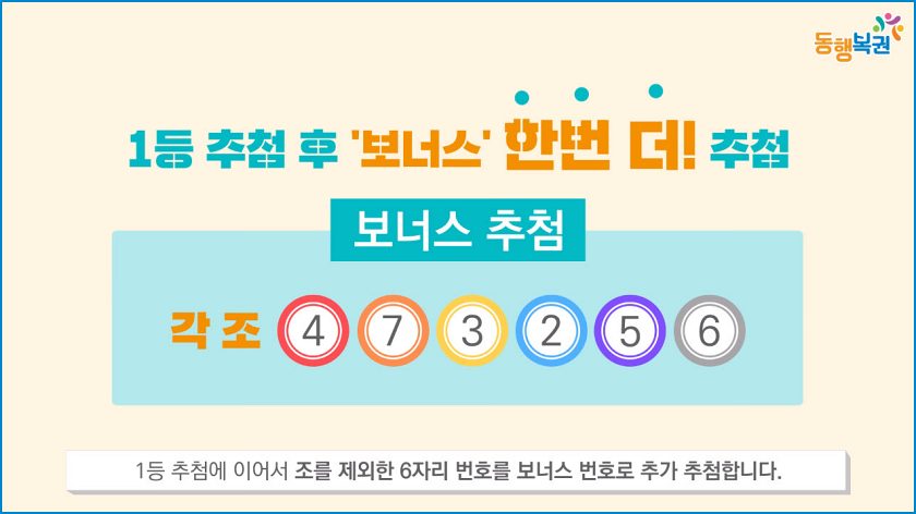 당첨번호는 총 6자리로 끝에서 한 자리씩 맞는 경우 7등부터 1등까지 정해집니다. 그리고 1등 추첨 후 조를 제외한 6자리 보너스 번호를 추가 추첨합니다.