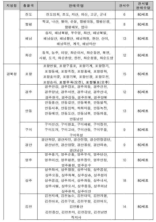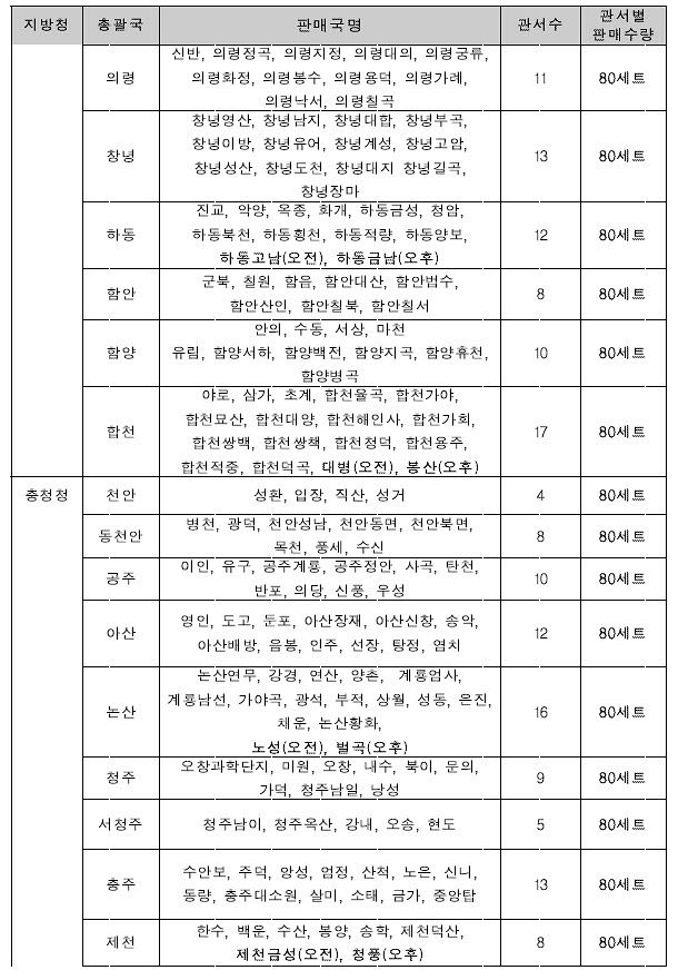 - 판매 관서 - 코로나 19 특별관리지역인 대구, 청도 지역과 공급여건이 취약한 전국 읍, 면 소재 우체국