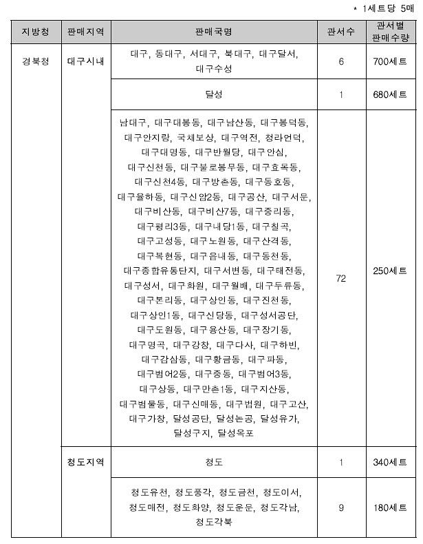 전국 우체국에서 판매할 하루 물량은 65만장으로 1인당 5매로 제한됩니다. 판매 우체국은 대구, 청도 지역 89개 우체국을 포함해 전국 1천406곳입니다.