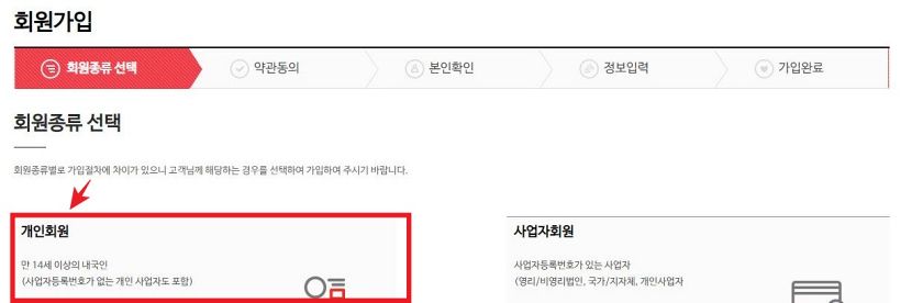 2. 회원 종류입니다. 개인 회원 또는 사업자 회원입니다. 본인에게 맞는 것을 선택합니다.