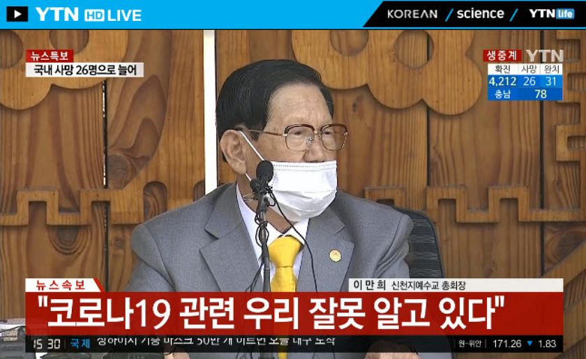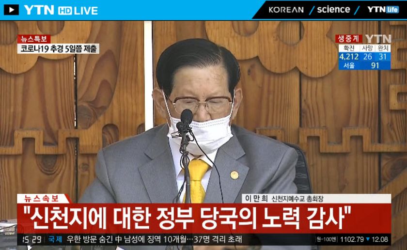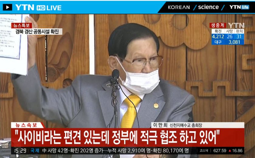 현재 YTN 실시간 뉴스에선 확진자 4천명을 돌파한 코로나19 사태의 핵심으로 꼽히는 신천지 총회장 이만희 씨가 처음으로 기자회견을 하고 있습니다. 앞서 신천지교회 측은 "우리는 이번 사태의 최대 피해자다. 신천지에 대한 마녀사냥을 멈춰달라"는 입장을 밝혔습니다.