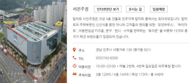 서원유통은 탑마트를 운영하고 있으며 부산을 연고로 하고 있습니다. 위의 주소로 이동하면 매장 검색뿐 아니라 지역별로도 검색이 가능합니다.