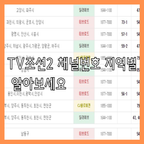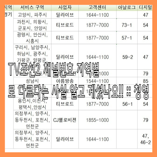 TV조선 2채널 번호는 서울과 인천/경기, 대구/경북, 부산/경남, 광주/전라도, 대전/충청, 강원/제주 등 7개 권역으로 나뉘어 정보를 제공하고 있습니다. 채널 번호 목록에는 지역 및 서비스 지역, 운영자, 고객 센터, 아날로그 및 디지털과 같은 정보가 표시됩니다.