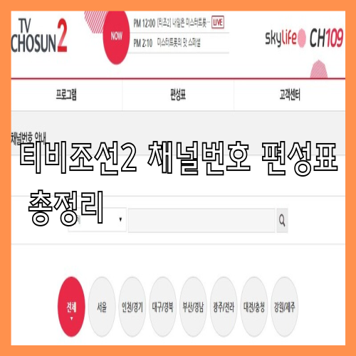 TV조선 2 채널 번호는 지역별, 전송 방송사별로 차이가 나는데 KT 스카이라이프와 IPTV의 경우 지역과 관계없이 지역별로 동일한 TV조선 2 채널 번호를 이용합니다. 위성방송인 KT 스카이라이프의 경우 TV조선 2 채널 번호로 109번을 사용했고 IPTV KT olleh는 69번, LG유플러스와 SK는 109번을 사용했습니다.