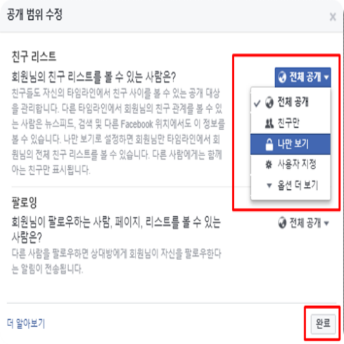 친구 목록을 공개하고 싶지 않으면 나만 표시를 선택합니다. 친구 목록 공개는 나뿐만 아니라 친구도 자신의 타임 라인에서 친구 사이를 볼 수 있는 공개 대상을 관리합니다.