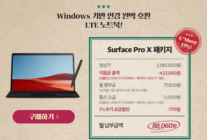 유플러스숍에서 단독 판매하는 '서피스 프로 X' 구매 시에는 시그니쳐 타입 커버, 슬림 펜, USB-C 허브, 충전기, 고급 슬리브 사은품까지 받을 수 있습니다. 이 외에도 갤럭시 북 S, 갤럭시탭 S6, 갤럭시탭 A 10.1까지 특별 할인가로 판매합니다.