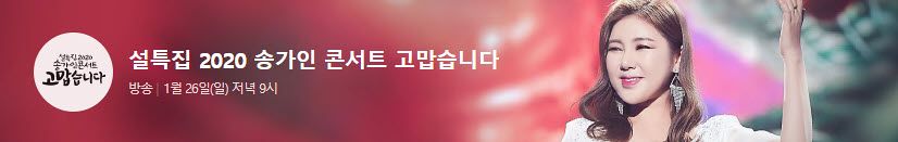 MBC는 지난 해 1월 11일 송가인 단독 콘서트 '가인이어라'를 방송했습니다. 그리고 이번에 또 '고맙습니다'를 26일 밤 9시에 방송했습니다. 저희가 고맙습니다.