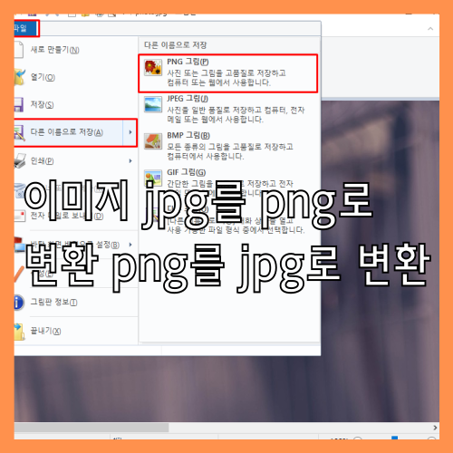 그림 플레이트는 창 검색 창을 사용하거나 실행 창 (윈도우 키 +r 키)에서 명령 \"mspaint\"를 입력하여 열 수 있습니다. PNG 사진을 '파일'로 변환하는 PNG 사진을 '파일'로 선택해 JPG 사진으로 변환하는 [파일]은 PNG 사진을 '그림판'으로 변환하는 열쇠로 저장 기능을 다른 이름으로 사용합니다.
