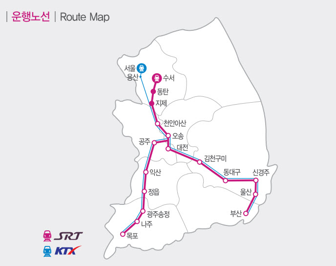 SRT는 KTX와 같이 최고 시속 300km로 운행되는 고속열차입니다. 수서~평택 지제역까지는 SRT 전용 철로를 이용하고 이후부터는 KTX와 같은 고속 철로를 이용합니다.